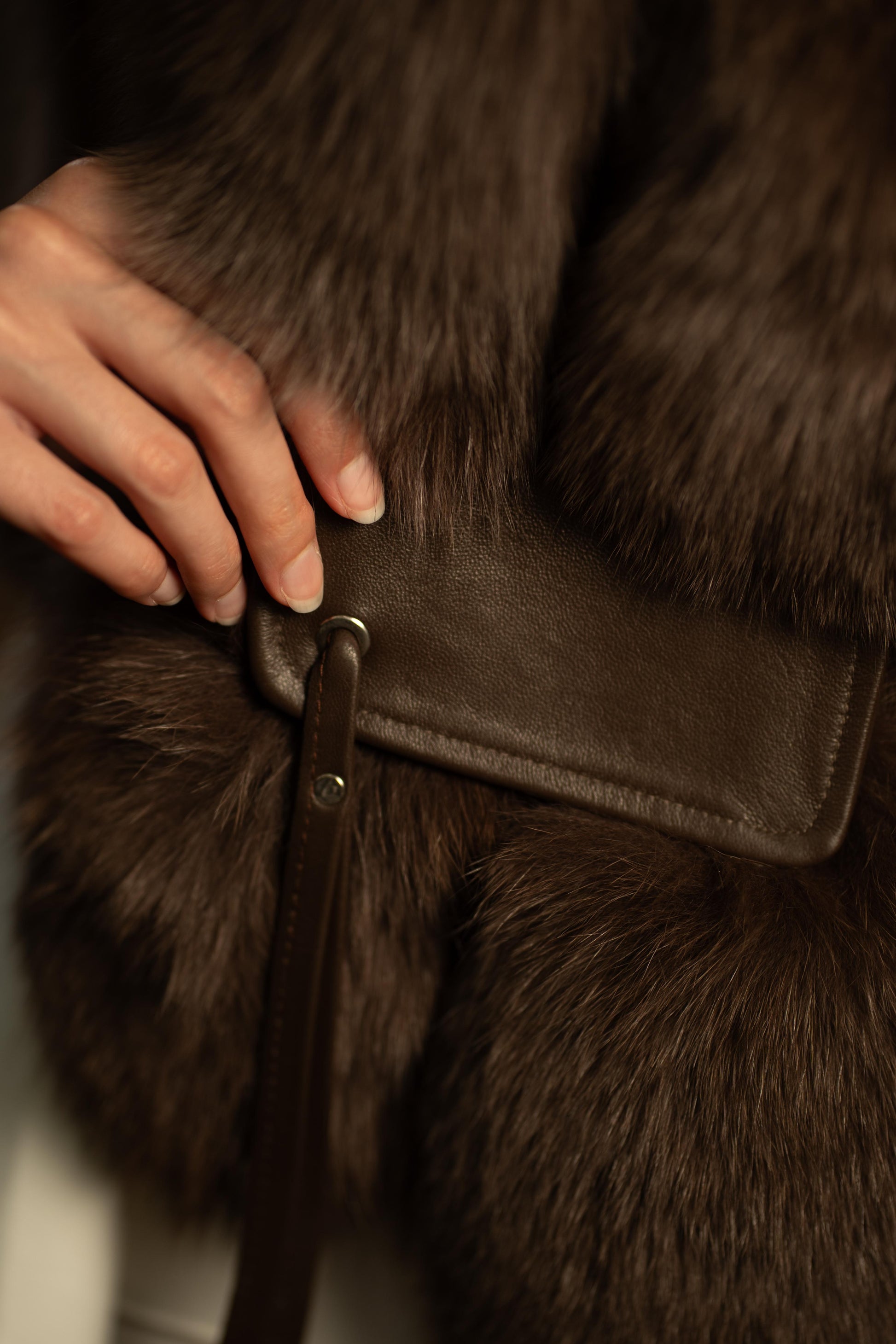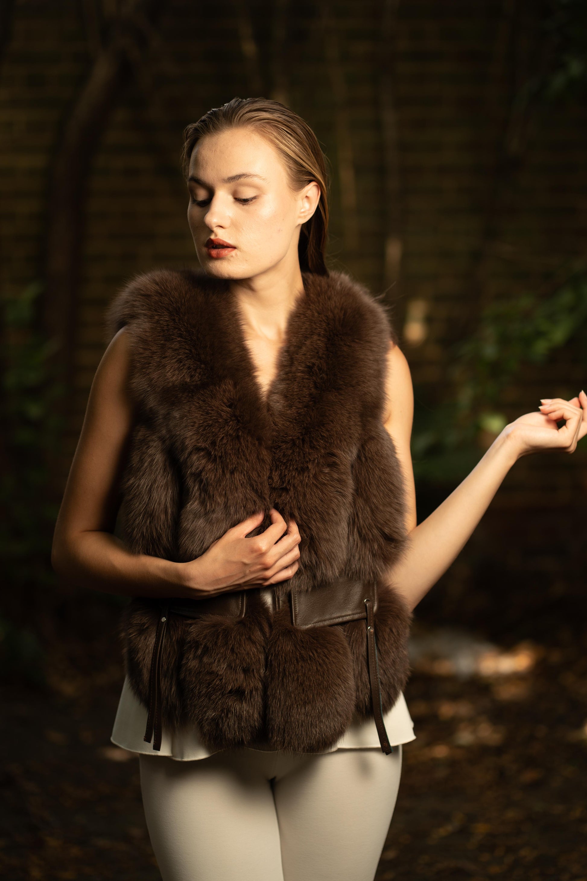 Faux Fur Gilet with Leather Pockets in Chocolate Brown