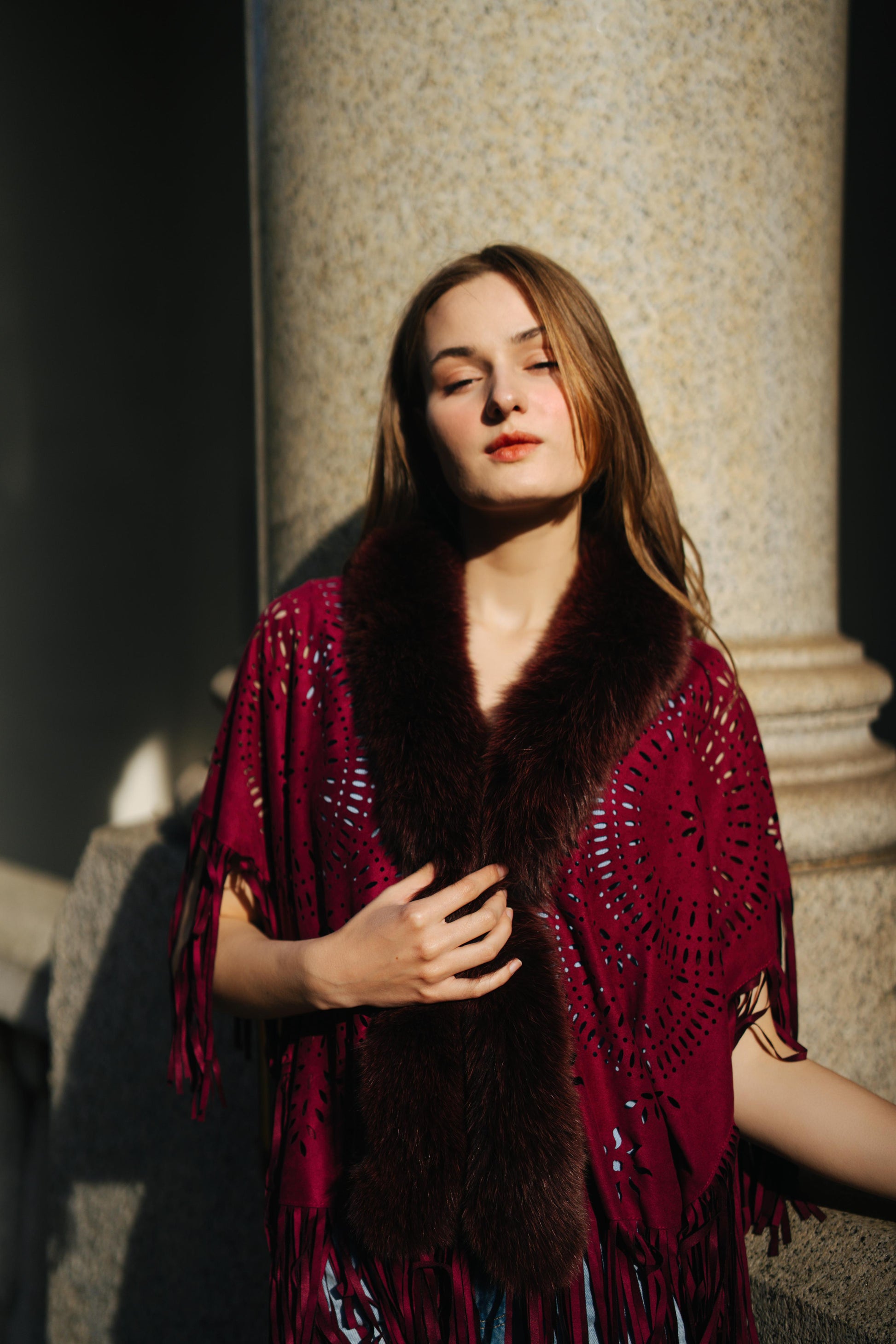 Laser cut faux suede elegantly lined with the fur to be worn as all day, all season wrap